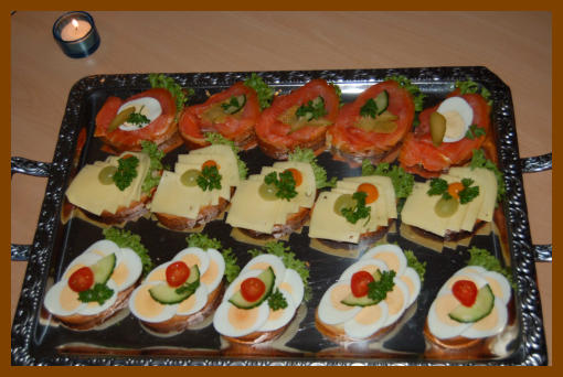 hausgemachte Mettwurst, Räucherlachs mit einer Honig-Senfsoße,